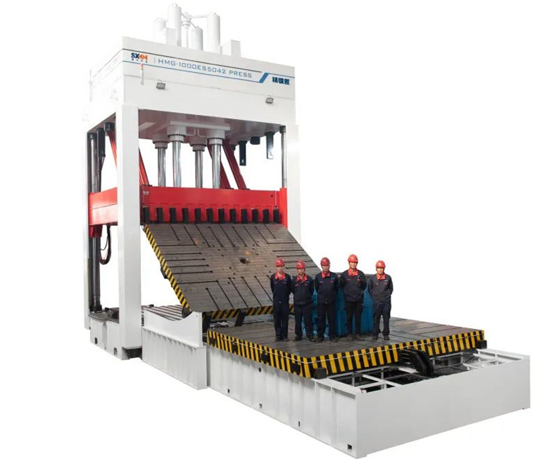 針對目前一體化成型模具,順興開浩公司研發(fā)了最大合模力1000噸,工作臺面5000mm×4200mm的超大型四導柱精密合模機。該超大型配模試驗機,下??沙休d260噸整體模具重量,上板可承載110噸模具,并實現(xiàn)180度翻轉(zhuǎn)功能。動模座配備0.02mm精度點動功能。適用于9000-12000T壓鑄島的模具。